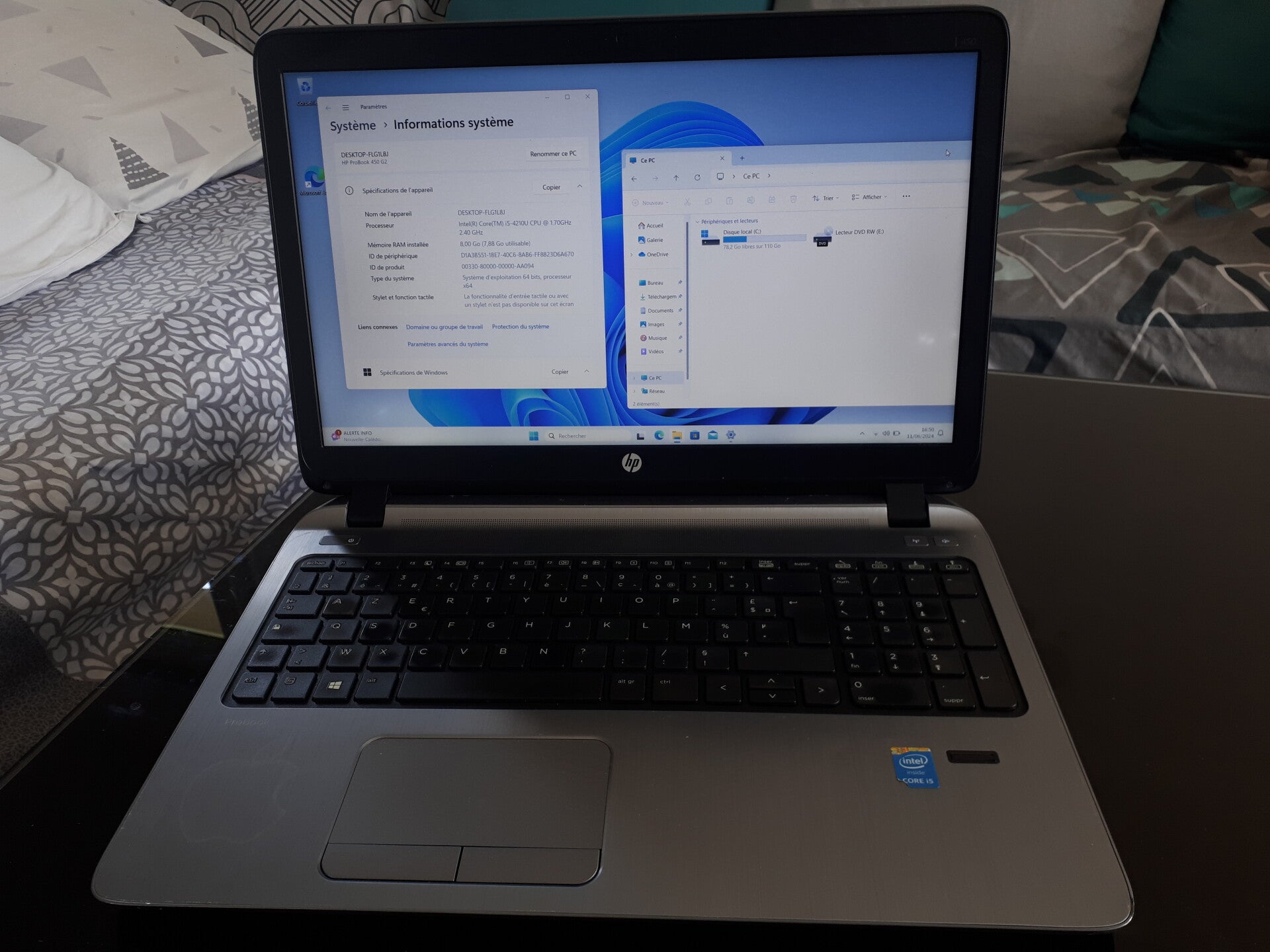 8GB de RAM disque dur SSD 120 GB et processeur Intel Core i5-4210U, taille de l'écran 15,6" aspect visuel (note allant de A à C en fonction de l'état visuel de l'appareil reconditionné, A étant un très bon état, B à un bon état et C à un état correct) : grade C systeme installé : Windows 11 défaut : petites taches sur l'ecran, peu dérangeant (le prix du produit a été nettement diminué en fonction du défaut)