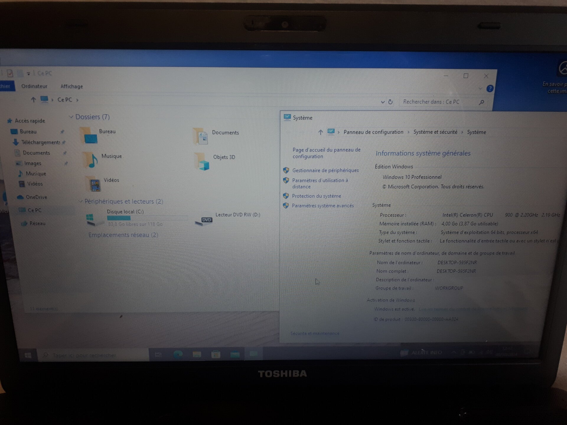 4GB de RAM disque dur SSD 120 GB et processeur Intel Celeron 900, taille de l'écran 15,6 aspect visuel (note allant de A à C en fonction de l'état visuel de l'appareil reconditionné, A étant un très bon état, B à un bon état et C à un état correct) : grade A systeme installé : Windows 10