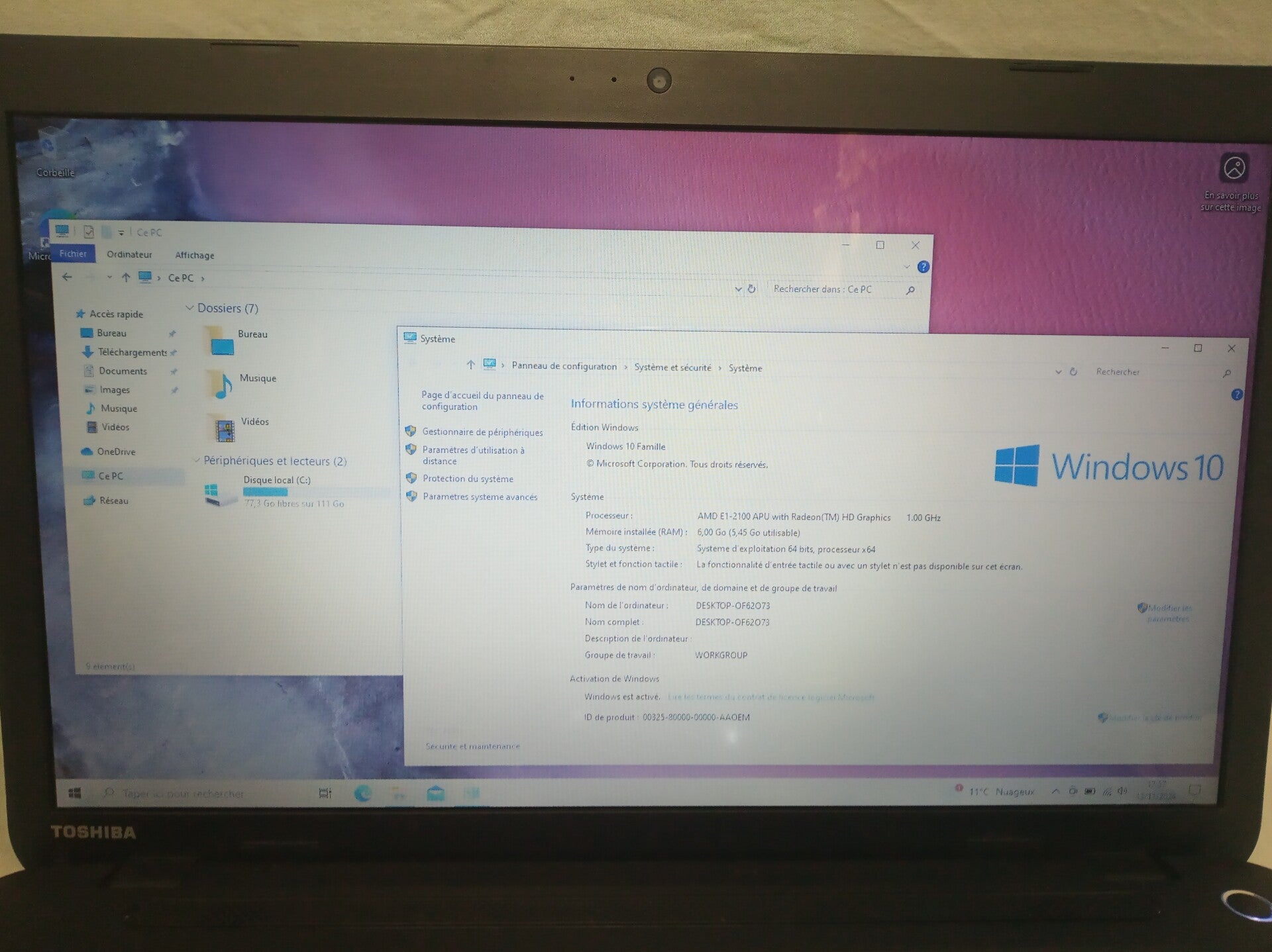 6GB de RAM disque dur SSD 120 GB et processeur AMD E1-2100, taille de l'écran 17 aspect visuel (note allant de A à C en fonction de l'état visuel de l'appareil reconditionné, A étant un très bon état, B à un bon état et C à un état correct) : grade B systeme installé : Windows 10