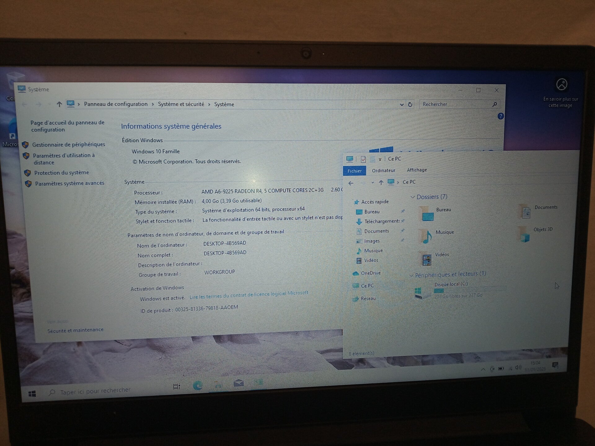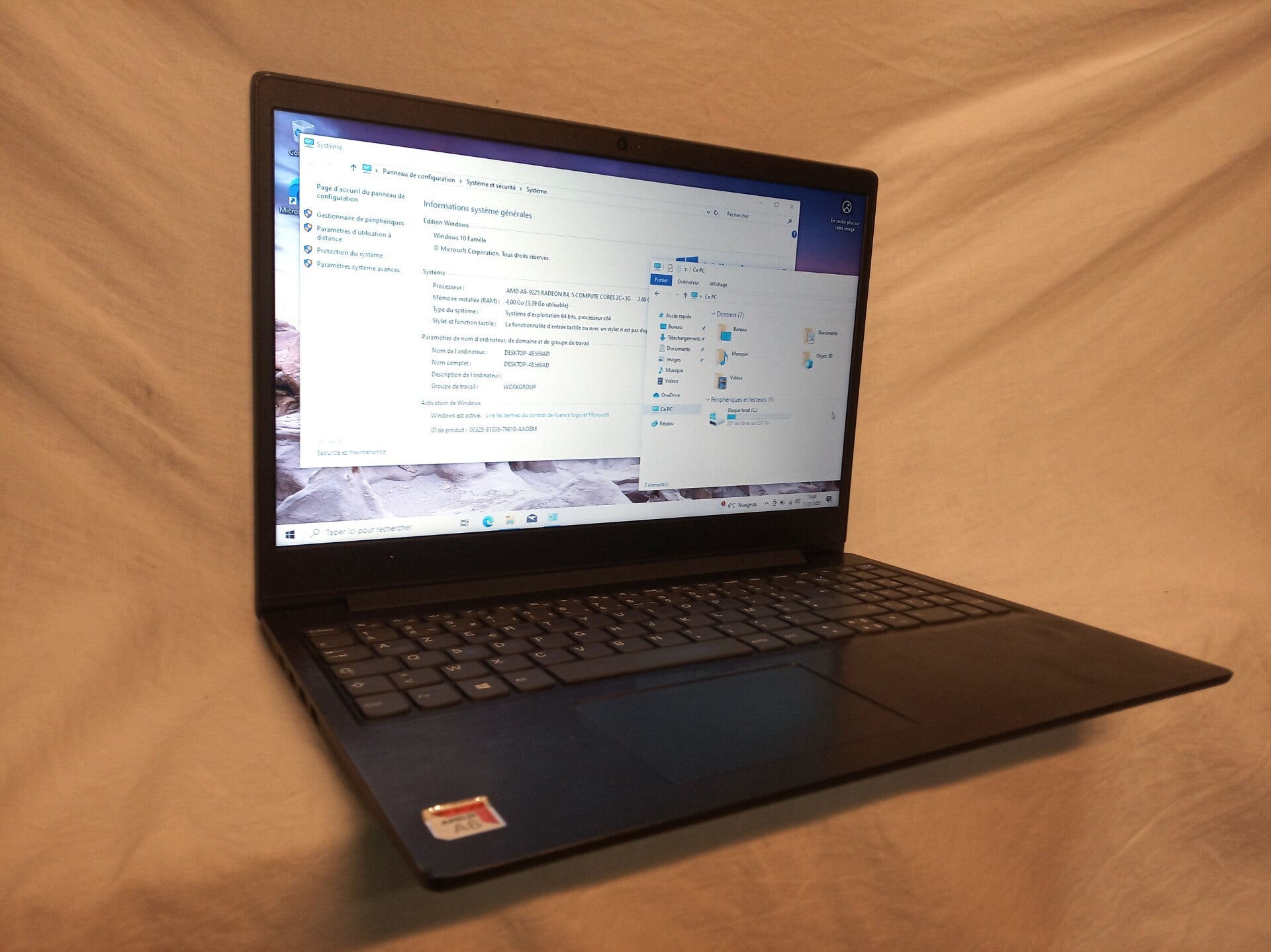 4GB de RAM disque dur SSD 240 GB et processeur AMD A6-9225 RADEON R4, taille de l'écran 15,6 aspect visuel (note allant de A à C en fonction de l'état visuel de l'appareil reconditionné, A étant un très bon état, B à un bon état et C à un état correct) : grade A systeme installé : Windows 10