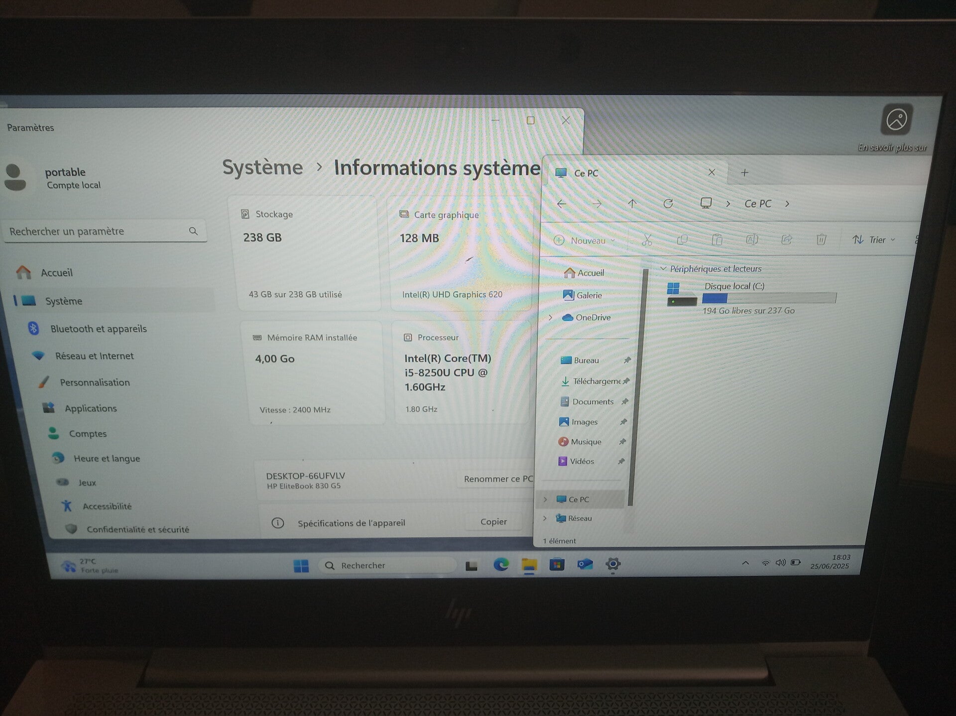 4GB de RAM disque dur SSD 240 GB et processeur Intel core i5-8250U, taille de l'écran 14" aspect visuel (note allant de A à C en fonction de l'état visuel de l'appareil reconditionné, A étant un très bon état, B à un bon état et C à un état correct) : grade C systeme installé : Windows 11 Bonus : Clavier rétro éclairé