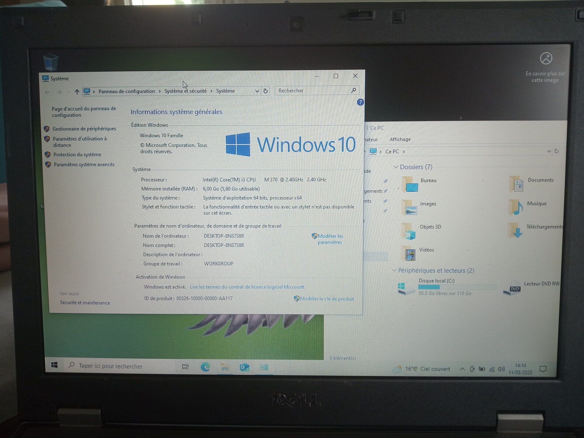 6GB de RAM disque dur SSD 120 GB et processeur Intel core i3-M370, taille de l'écran 14" aspect visuel (note allant de A à C en fonction de l'état visuel de l'appareil reconditionné, A étant un très bon état, B à un bon état et C à un état correct) : grade B systeme installé : Windows 10