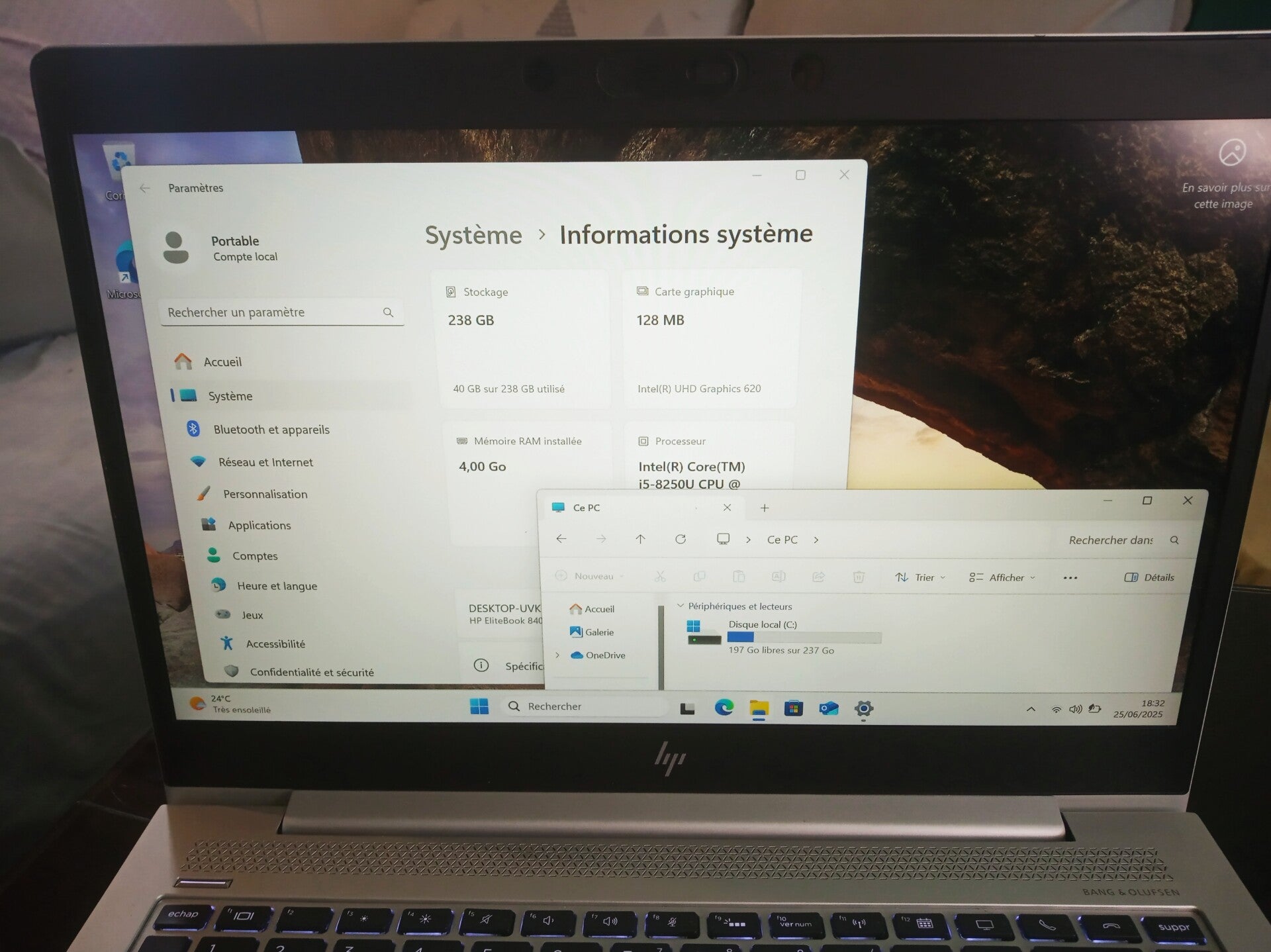 4GB de RAM disque dur SSD 240 GB et processeur Intel core i5-8250U, taille de l'écran 14" aspect visuel (note allant de A à C en fonction de l'état visuel de l'appareil reconditionné, A étant un très bon état, B à un bon état et C à un état correct) : grade A systeme installé : Windows 11 Bonus : Clavier rétro éclairé