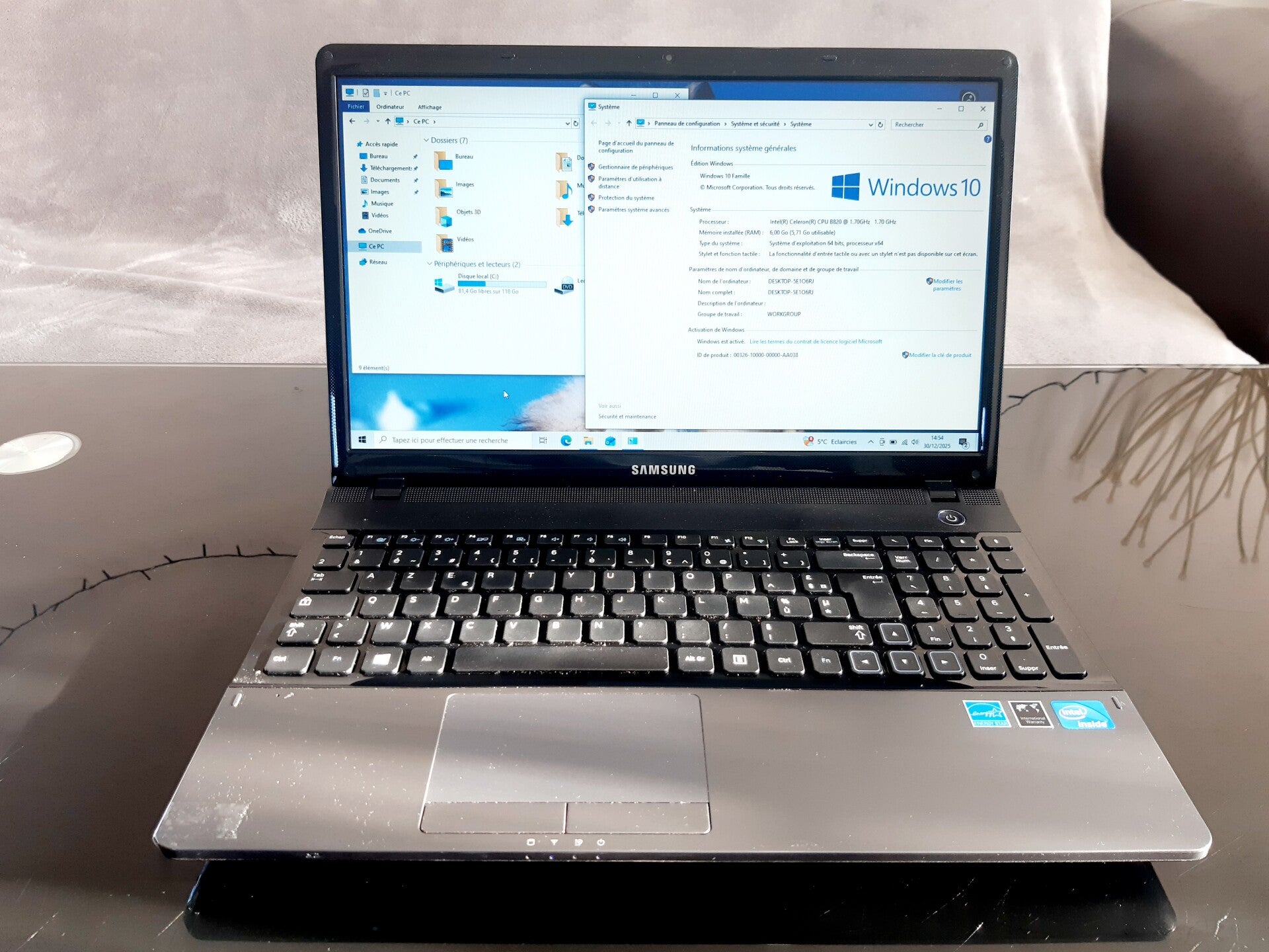 6GB de RAM disque dur SSD 128 GB et processeur Intel B820, taille de l'écran 15,6" aspect visuel (note allant de A à C en fonction de l'état visuel de l'appareil reconditionné, A étant un très bon état, B à un bon état et C à un état correct) : grade A systeme installé : Windows 10 sans camera sans micro (le prix du produit a été nettement diminué en fonction du défaut)