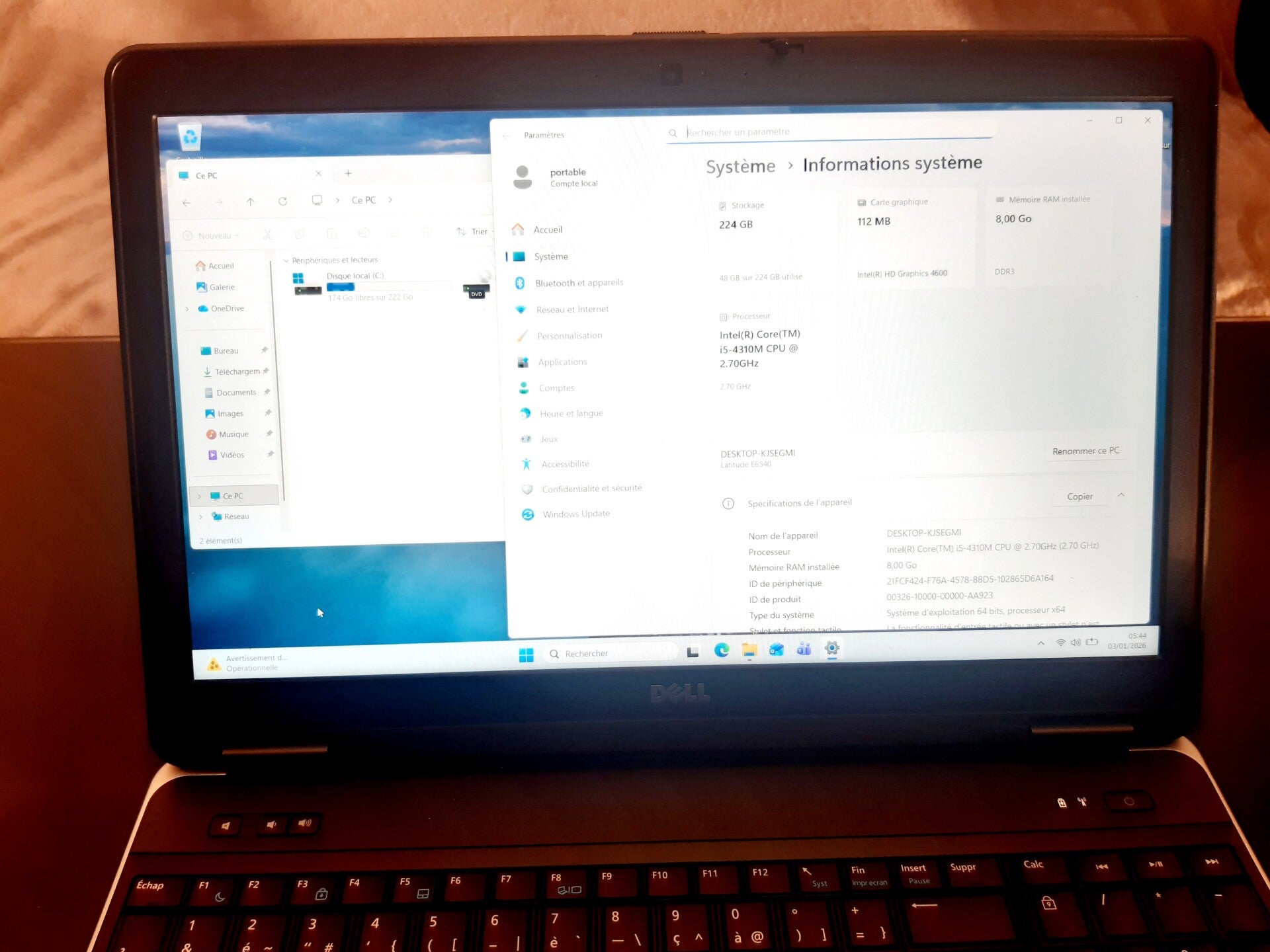 8GB de RAM disque dur SSD 240 GB et processeur Intel Core i5-4310M, taille de l'écran 15,6" aspect visuel (note allant de A à C en fonction de l'état visuel de l'appareil reconditionné, A étant un très bon état, B à un bon état et C à un état correct) : grade A systeme installé : Windows 11