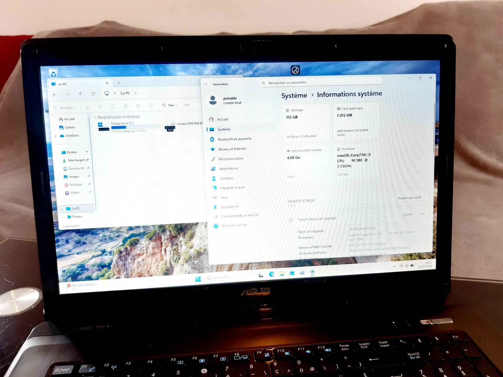 4GB de RAM disque dur SSD 120 GB et processeur Intel Core i3-M380, taille de l'écran 17,3" aspect visuel (note allant de A à C en fonction de l'état visuel de l'appareil reconditionné, A étant un très bon état, B à un bon état et C à un état correct) : grade A systeme installé : Windows 11