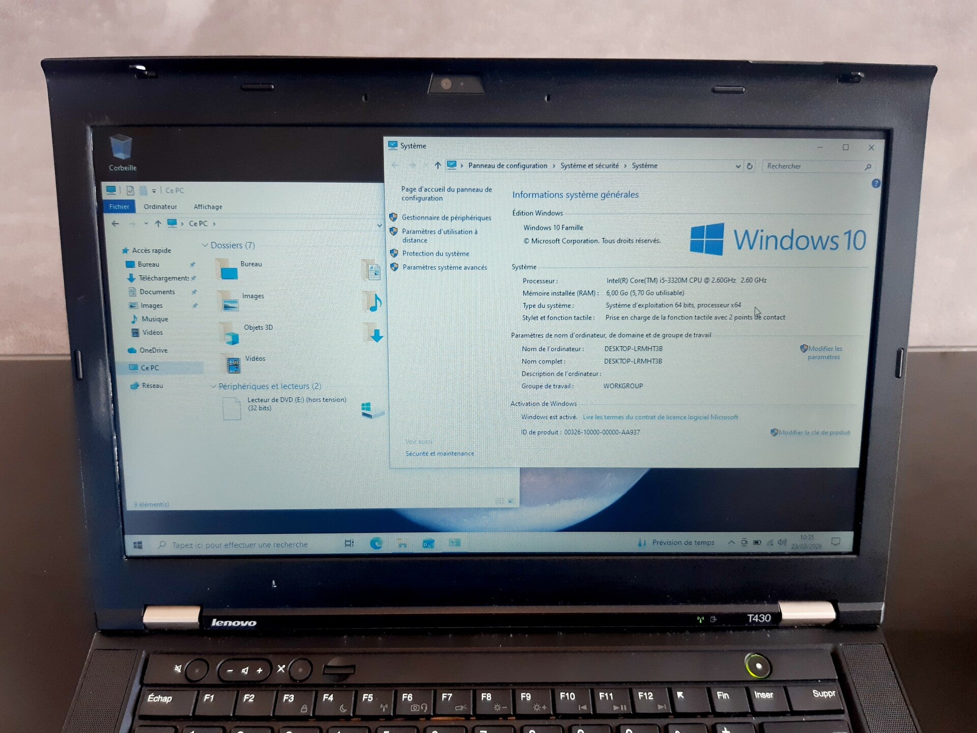 6GB de RAM disque dur SSD 120 GB et processeur Intel Core i5-3320M, taille de l'écran 14.1'' aspect visuel (note allant de A à C en fonction de l'état visuel de l'appareil reconditionné, A étant un très bon état, B à un bon état et C à un état correct) : grade B systeme installé : Windows 10