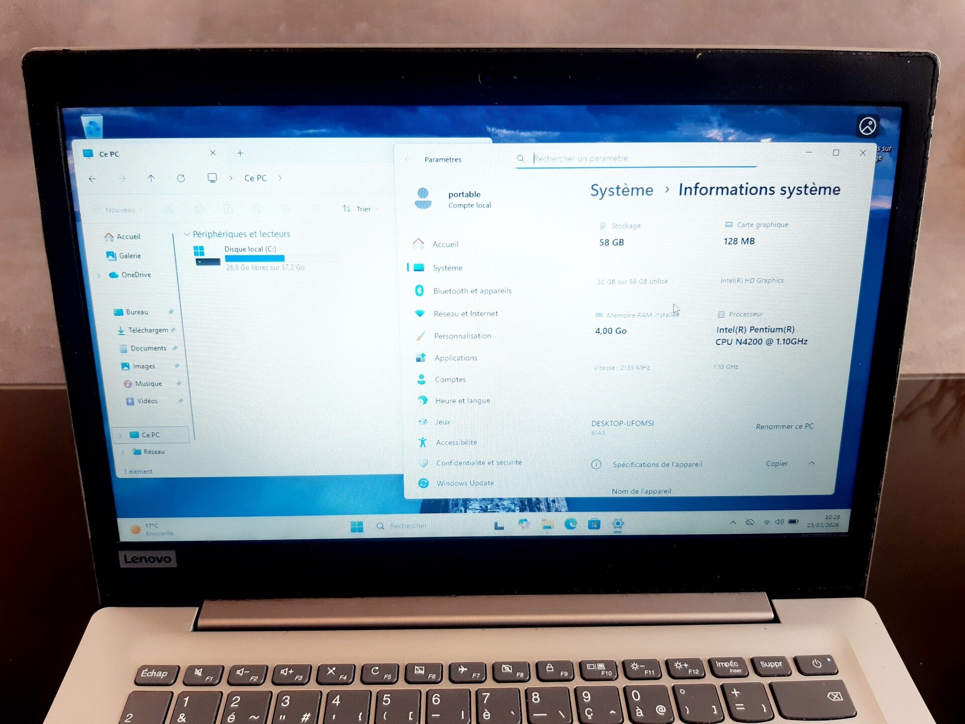4GB de RAM disque dur SSD 64 GB et processeur Intel Pentium N4200, taille de l'écran 14" aspect visuel (note allant de A à C en fonction de l'état visuel de l'appareil reconditionné, A étant un très bon état, B à un bon état et C à un état correct) : grade C systeme installé : Windows 11