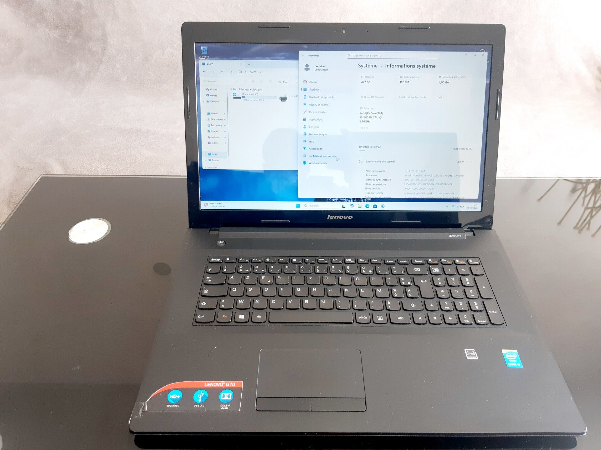 6GB de RAM disque dur SSD 512 GB et processeur Intel Core i3-4005U, taille de l'écran 17,3" aspect visuel (note allant de A à C en fonction de l'état visuel de l'appareil reconditionné, A étant un très bon état, B à un bon état et C à un état correct) : grade B systeme installé : Windows 11
